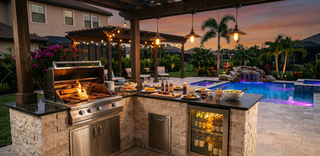 Provide shade over the cooking area if possible. Cooking in direct Florida sun is uncomfortable. A pergola or covered structure makes the space usable throughout the day.